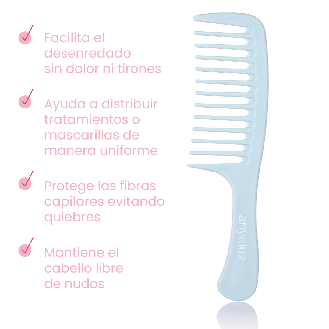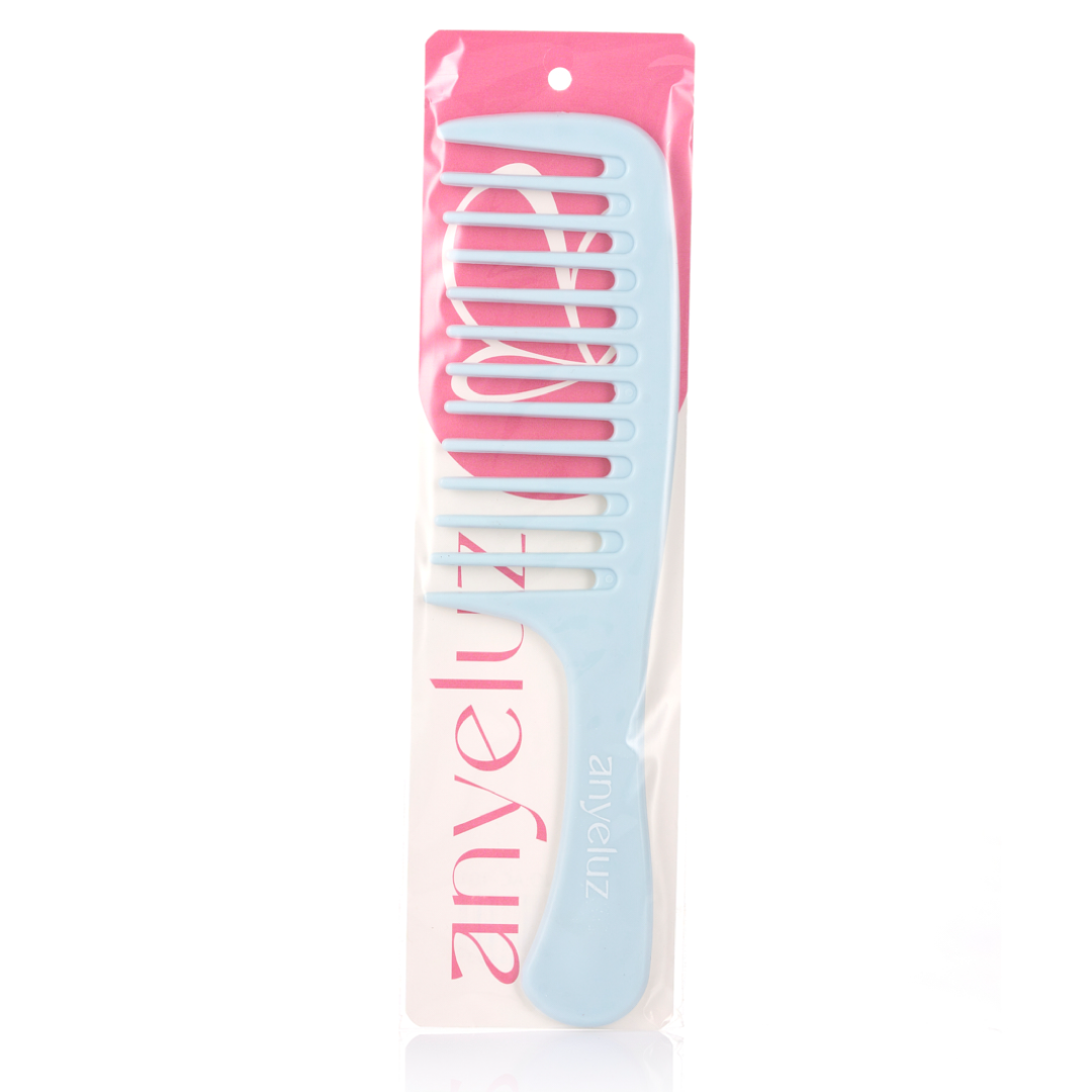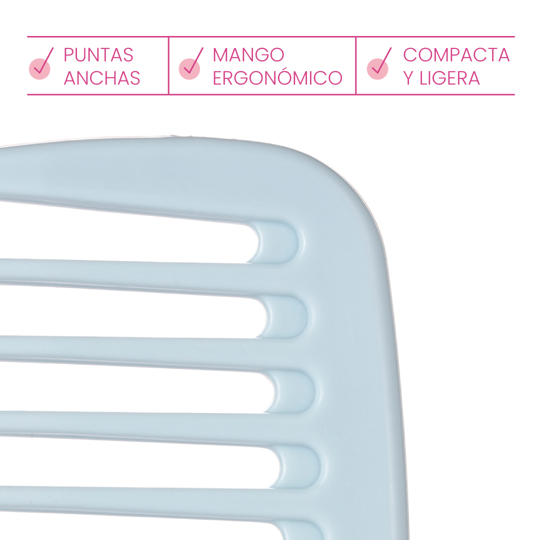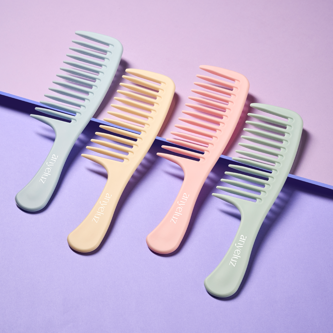 Peinilla desenredante Anyeluz, con puntas separadas que se deslizan suavemente entre el cabello, evitando daños y ayudando a mantenerlo saludable y sin frizz. Es perfecta para proteger la fibra capilar y facilitar estilizados rápidos. Disponible en 4 tonos pastel: azul, amarillo, rosa y verde menta.