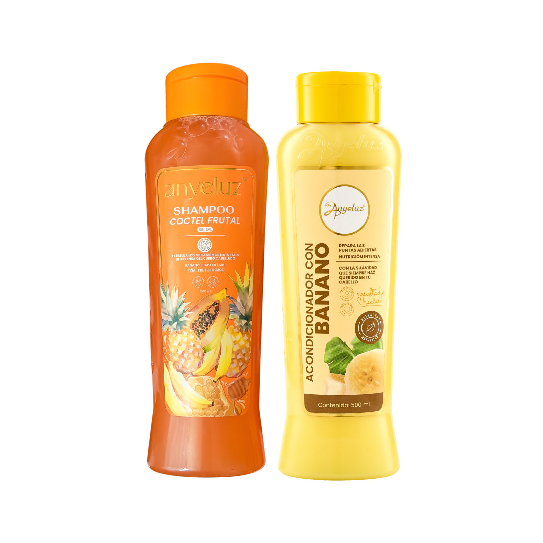 El balance perfecto para tu cabello: reparación e hidratación. El shampoo cóctel frutal ayuda a recuperar la salud capilar, mientras que el acondicionador con banano proporciona un extra de nutrición para un cabello más suave y manejable.