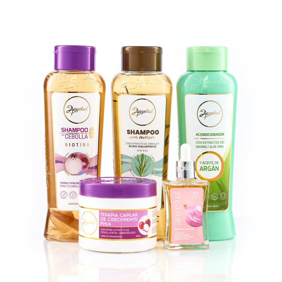 El shampoo con Cebolla: (sin sal ni parabenos), tiene en su formulación activos que promueven el crecimiento del cabello, tiene incorporado cascos cebolla natural, que por medio de un proceso de desnaturalización se elimina el olor desagradable de la misma y se logra extraer sus componentes activos que tradicionalmente han funcionado en el crecimiento del cabello. El Shampoo con Cebolla marca ANYELUZ® es el único en el mercado que trae la cebolla adentro, lo cual lo convierte en una fórmula única concentrada.