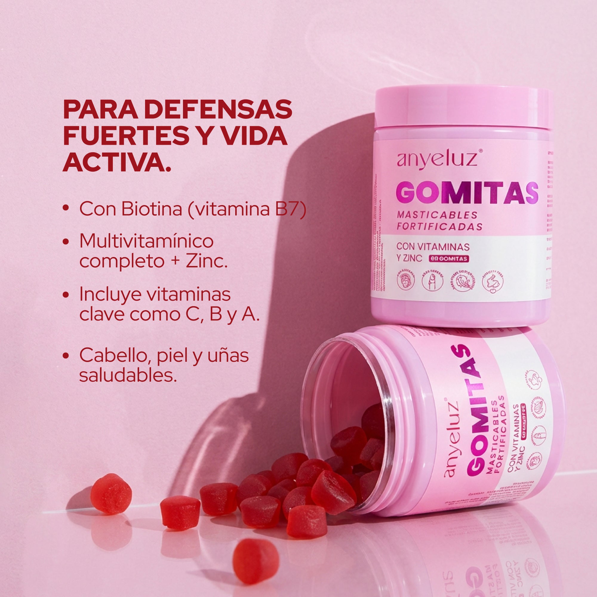 Las Gomitas Masticables Fortificadas con Vitaminas y Zinc son un aliado diario en formato gomita diseñado para aportar apoyo diario a tu sistema inmunológico, energía, piel radiante, uñas fuertes y bienestar general. Cada gomita combina vitaminas esenciales (A, B3, B5, B6, C, B12, biotina) con zinc y magnesio para ofrecer una nutrición que ayuda a reforzar tus defensas, mantener la salud celular y complementar fácilmente tu alimentación diaria.