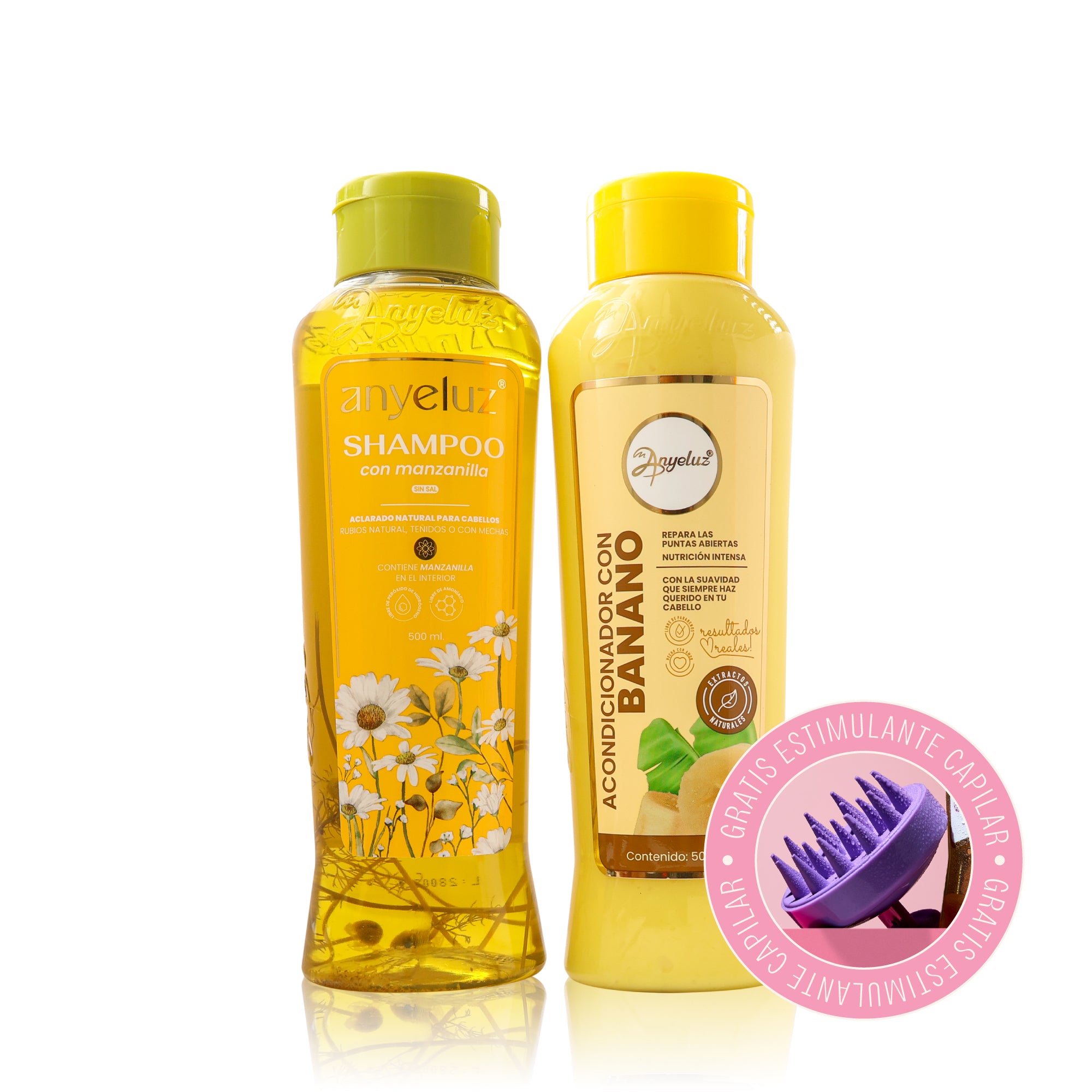 ¡El combo perfecto para cabellos claros y dorados! El shampoo con manzanilla aclara de forma sutil los tonos rubios y dorados, mientras que el acondicionador con banano proporciona una nutrición intensa, dejando el cabello más manejable y sedoso.