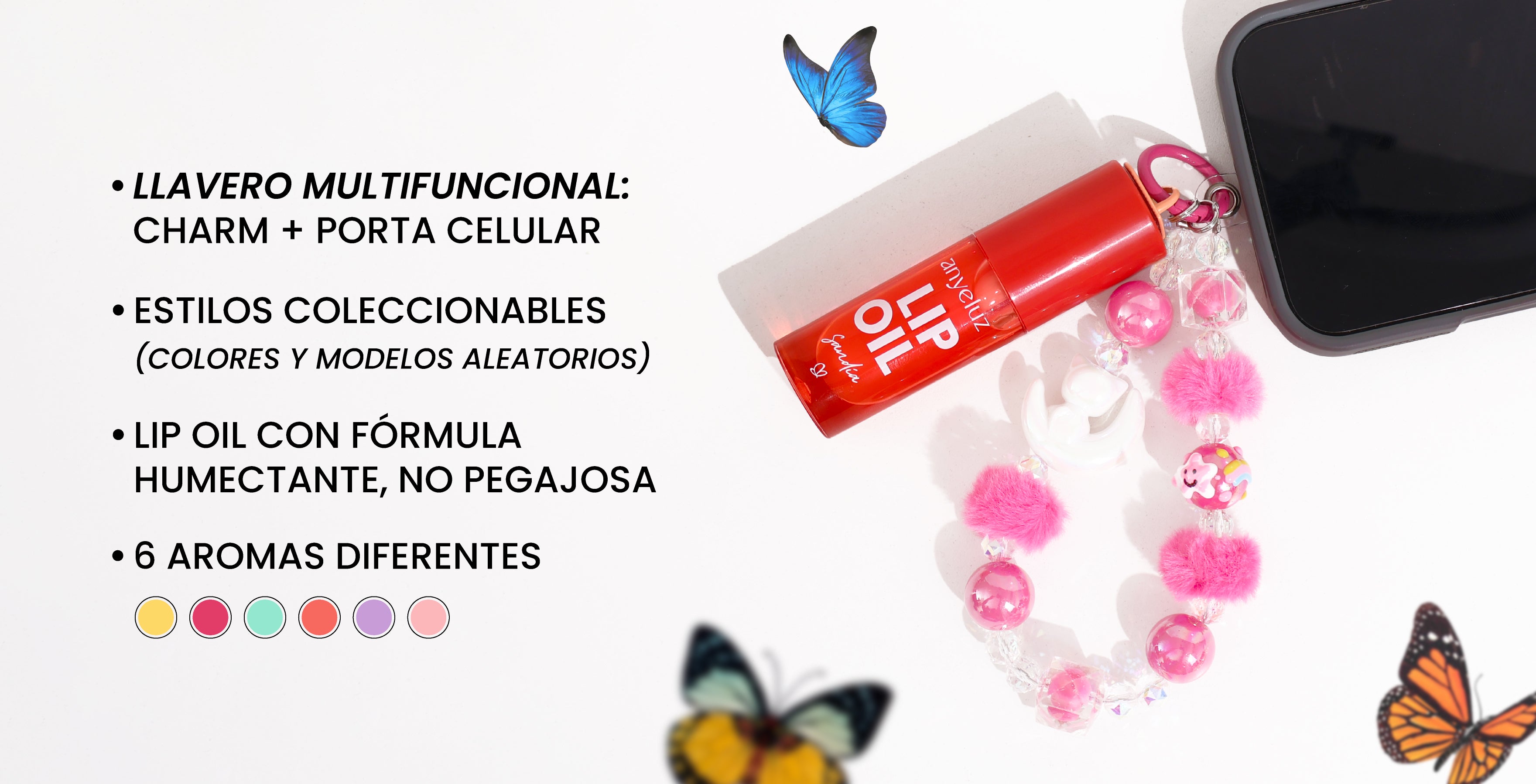 Nuestro Lip Oil + Llavero Porta Celular es el combo perfecto: un aceite labial hidratante con sabores frutales irresistibles (banano, durazno, menta, sandía, uva y lychee) que nutre tus labios y los deja con brillo. Y un charm coleccionable que funciona como llavero porta celular, ideal para sujetar tu teléfono con estilo.