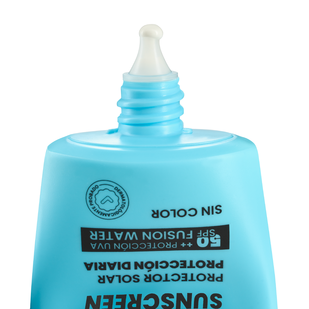 SUNSCREEN SPF50+ Fusion Water (sin color) es un protector facial de base acuosa diseñado para quien busca protección máxima sin alterar el tono de piel. Su textura ligera se absorbe rápido, protege contra UVA/UVB y ofrece un acabado luminoso sin dejar residuo blanco ni efecto flashback.