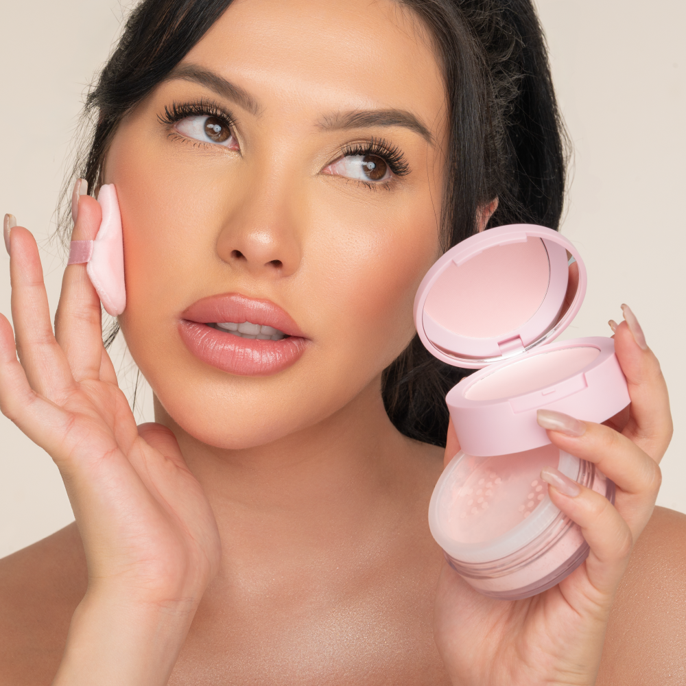 Distribuye el polvo suelto en todo el rostro o en las zonas con más brillo (zona T) para sellar el maquillaje