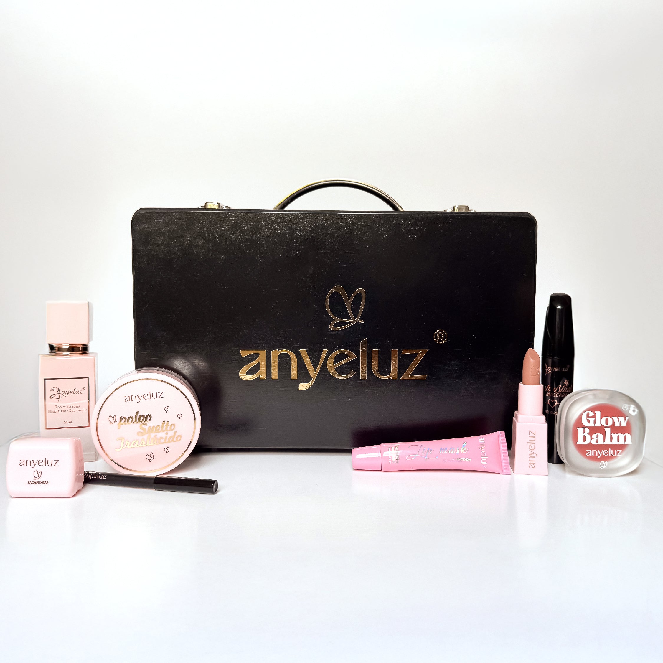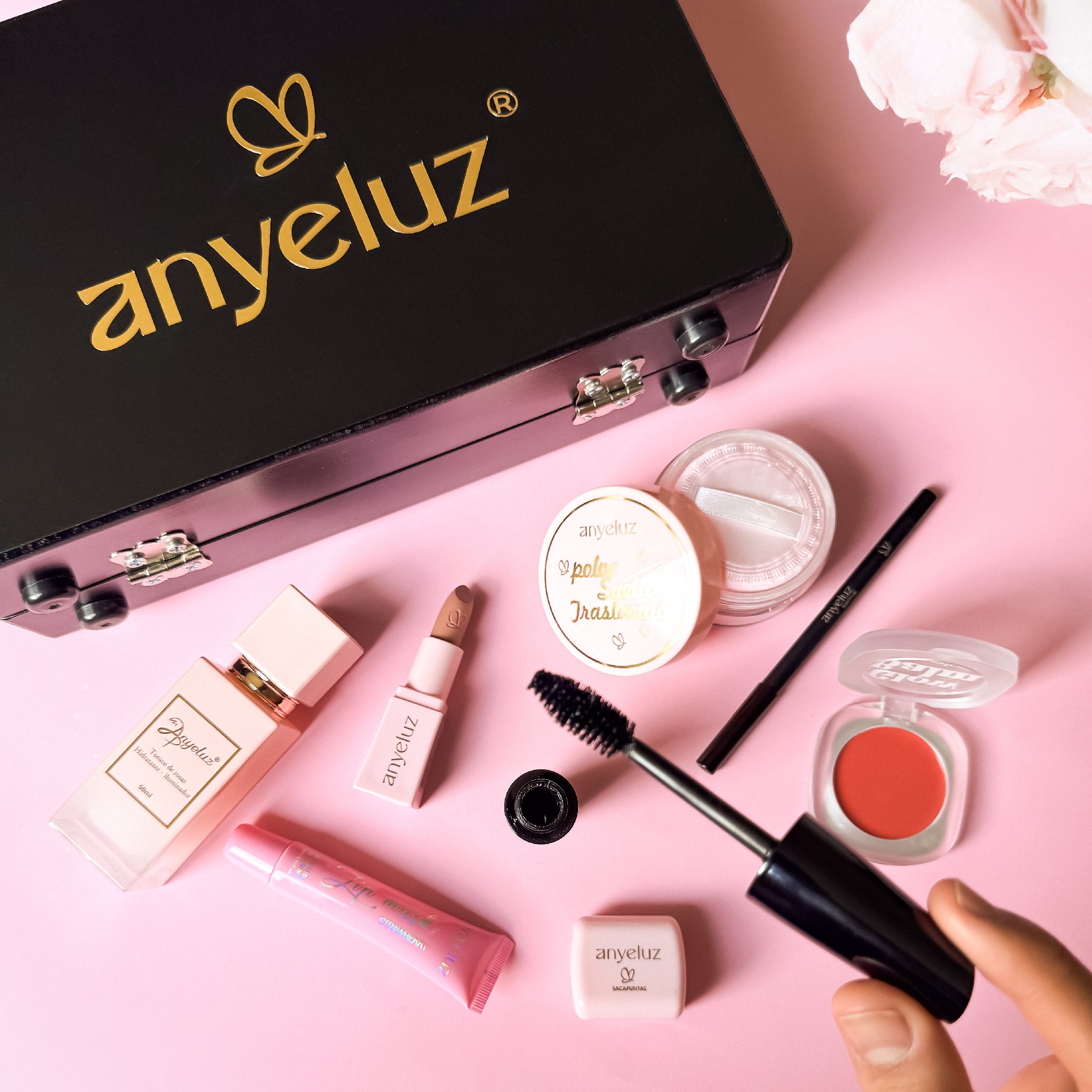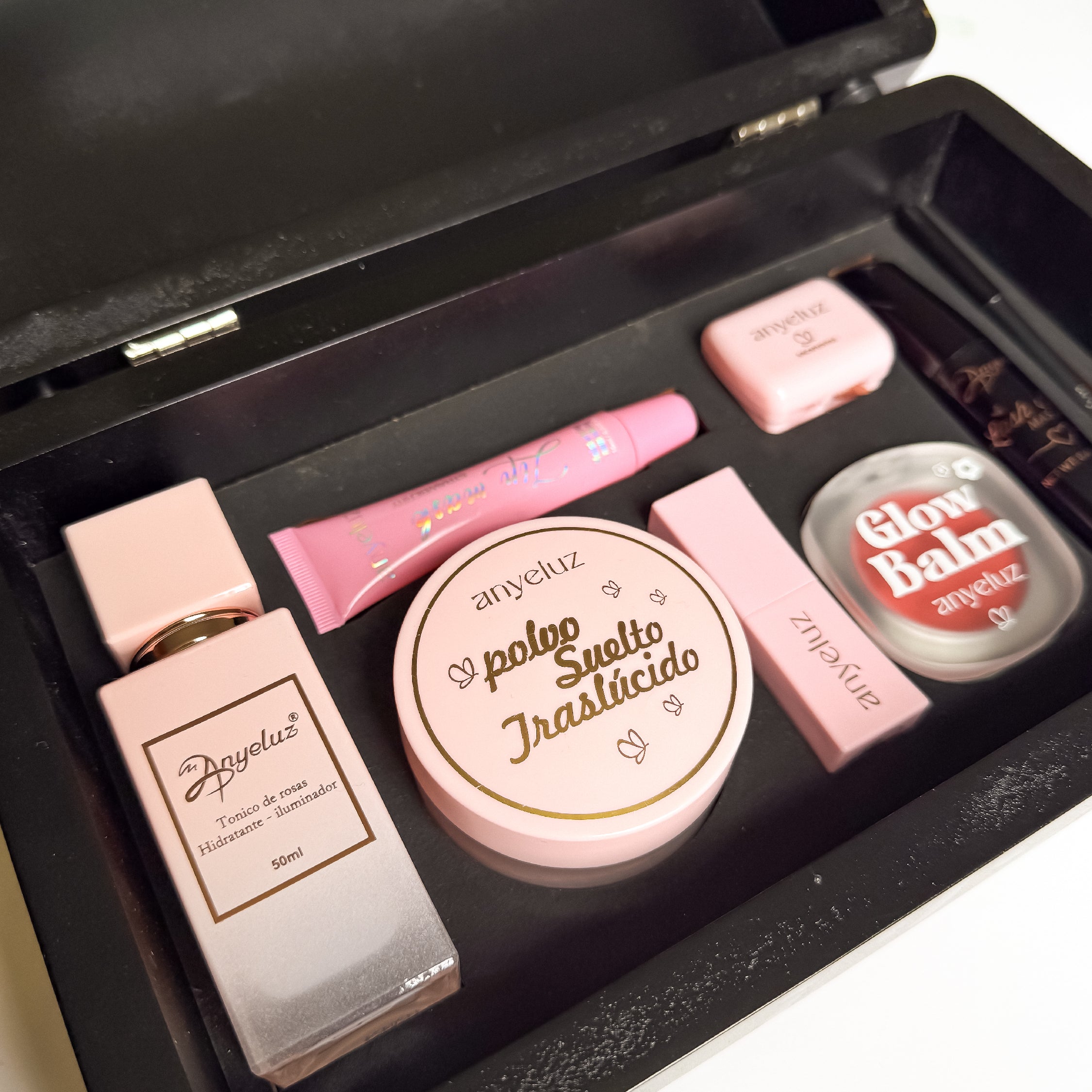 Incluye una selección de productos indispensables de nuestra marca: sacapuntas, polvo traslúcido, pestañina, lápiz delineador negro, lip balm, rubor Petal Blush, labial Lady, y tónico de rosas.